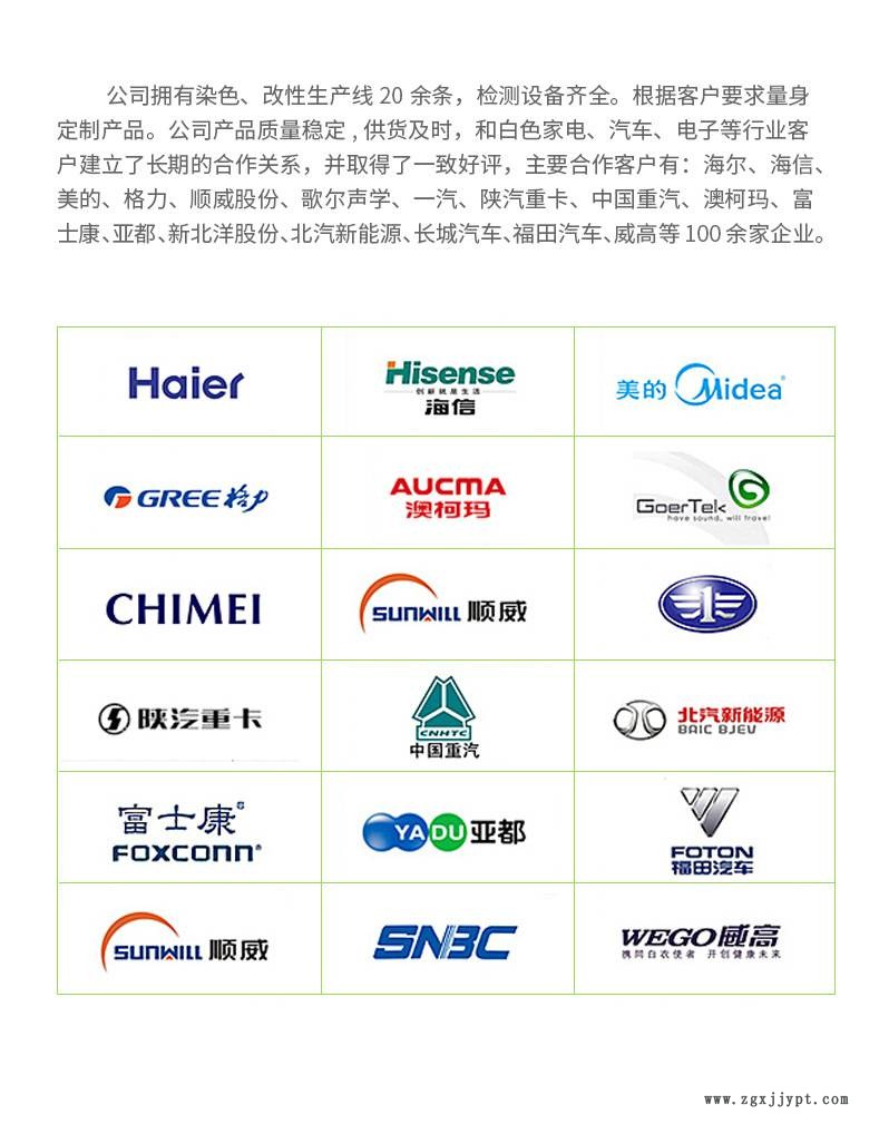 ——公司研发生产各种填充、阻燃、增强改性PP、ABS、AS、PC、PC/ABS、PA等改性塑料粒子;