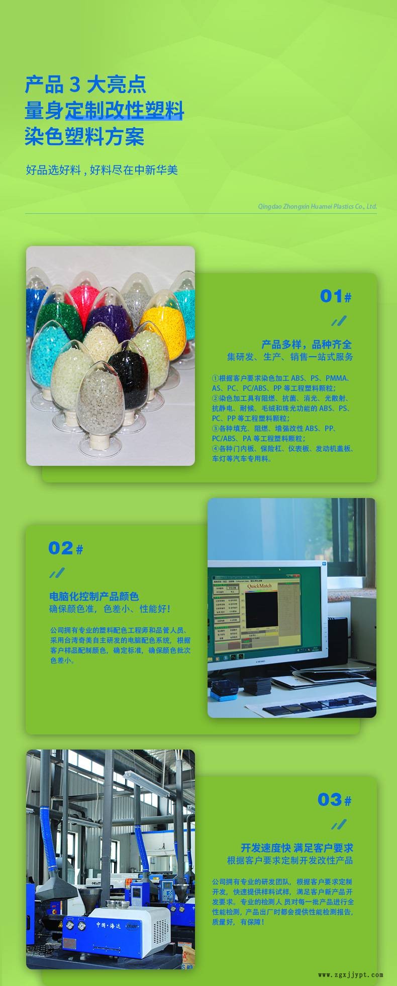 ——公司研发生产各种填充、阻燃、增强改性PP、ABS、AS、PC、PC/ABS、PA等改性塑料粒子;