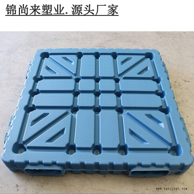 锦尚来「塑料托盘」特点:整体一次吹塑成型,单面使用 四向进叉;成品重量轻、承载强度高。抗冲击性能高,运输途中我们的「塑料托盘」是可以套叠, 节省存储空间和运输成本。