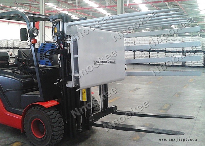 这一点,在时常需要倾倒材料的食品行业、化工行业当中可见一斑。叉车举起一千几百公斤重的材料可谓毫不费力,可要稍稍弯个角度,这个时候,就必须要装载上可以弯腰的工具了——诺克旋转式推出器。