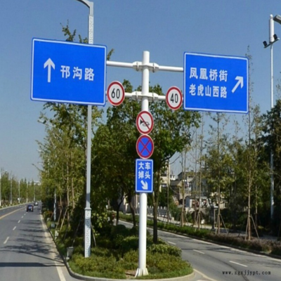 5、安装:在经过监理确认基础强度具备安装条件后方可进行安装。交通标志杆的安装方法有多种,常用的方法如下:①应先将交通标志杆立杆置于平坦开阔场地,横臂方向平行于地面;②在横臂安装位置地面铺设保护垫层,将交通标志牌图案一面朝向地面放置于垫层上,调整标志牌距离立杆距离,调整标志牌下沿与底法兰之间的距离≥5.5m;③安装横臂,校正横臂与立杆垂直;④将交通标志牌采用抱箍固定在横臂上。