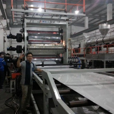 PP输送带板材生产线生产工艺流程:PE、PP板材以树脂为主要原料加上各种塑料助剂,经挤出机挤出而成的,PE、PP板材一般为白色,可依用户要求生产其它颜色,添加色母料即可。其工艺流程为:配方---混料---挤出----定型----牵引----切割----卸料。1、将混好的料置入上料机2、进入挤出机中热融3、进入成型聚乙烯板的模具机中成形4、以裁切机裁切为成品。
