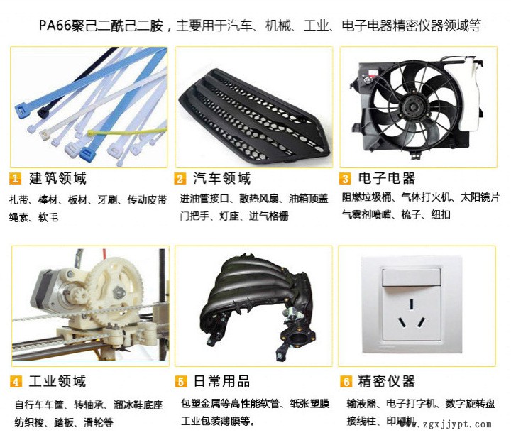 1、具有优良的耐磨性、自润滑性,机械强度较高。但吸水性较大,因而尺寸稳定性较差 2、PA66在较高温度也能保持较强的强度和刚度。PA66在成型后仍然具有吸湿性,其程度主要取决于材料的组成、壁厚以及环境条件。 3、在产品设计时,一定要考虑吸湿性对几何稳定性的影响。为了提高PA66的机械特性,经常加入各种各样的改性剂。玻璃就是.常见的添加剂,有时为了提高抗冲击性还加入合成橡胶,如EPDM和SBR等。PA66的粘性较低,因此流动性很好(但不如PA6)。这个性质可以用来加工很薄的元件。它的粘度对温度变化很敏感。 4、PA66的收缩率在1%~2%之间,加入玻璃纤维添加剂可以将收缩率降低到0.2%~1% 。收缩率在流程方向和与流程方向相垂直方向上的相异是较大的。PA66对许多溶剂具有抗溶性,但对酸和其它一些氯化剂的抵抗力较弱。
