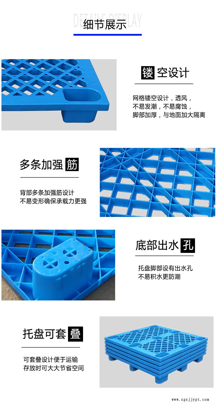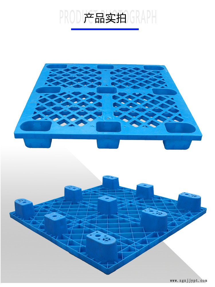 九脚网格塑料托盘:九脚网格托盘其底部是有‘九个腿’组成的,表面为‘网格’状,顾行业为方便称其为九脚网格托盘,九脚网格托盘大多型号的都为轻型的塑料托盘,不易用于上货架或者较重货物的周转使用,大多情况下九脚网格塑料托盘都是用来仓库货物垫仓板防潮使用,对于轻型货物的周转也可。