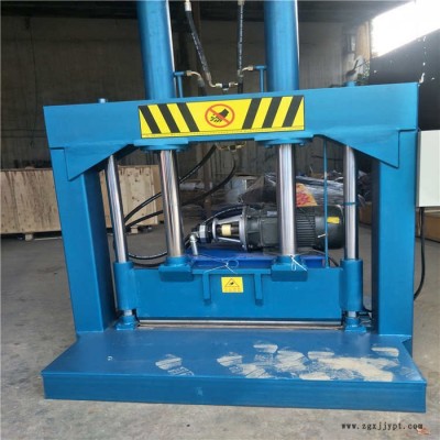 切生胶时,用人工将胶料放在切胶刀的下方,然后按下启动按钮,则切胶刀在活塞杆的带动下沿机架上的滑道落下将胶料切开。