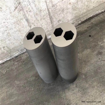 由熔融金属状态直接连续(或半连续的)制造棒材或管材等先进的生产方法。人造石墨作为有色金属的连续铸造或半连续铸造用模具被认为是合适的材料。生产实践证明,连续铸造行业采用石墨模具,因其导热性能良好(导热性能决定了金属或合金的凝固速度),模具的自润滑性能好等因素,不但使铸型速度提高,而且由于铸锭的尺寸,表面光滑,结晶组织均匀,可直接进行下道工序的加工。这不仅大大提高了成品率,减少了废品损失,而且产品质量也有大幅度的提高。